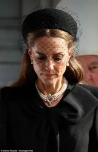 Dressed in all-black mourning attire, Kate’s choice of accessories carried profound historical weight.