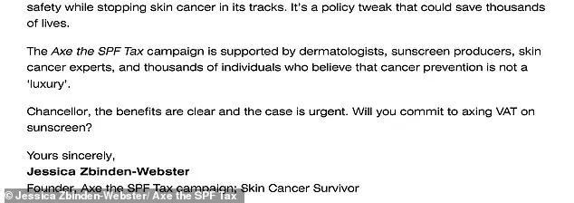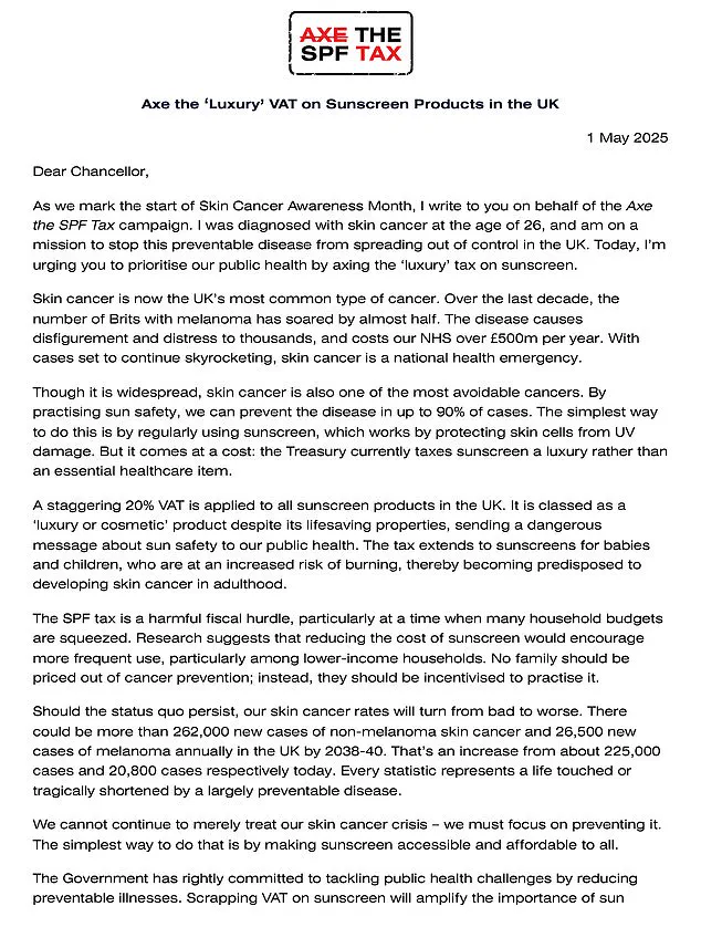 She argues strongly for the Chancellor to eliminate the so-called ‘luxury’ tax on sunscreen products, aiming to reduce financial burdens not only on consumers but also on the National Health Service (NHS).