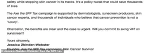 Jessica is campaigning to remove the 20 per cent tax on sunscreen, which is currently classed as a luxury or cosmetic product