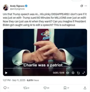 The recent Oval Office address by President Donald Trump following the assassination of conservative activist Charlie Kirk has sparked a contentious debate over the authenticity of the video.