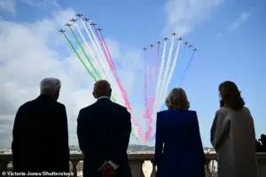 The Frecce Tricolori and Red Arrows took to the skies in an intricate aerial ballet, emitting vivid streams of smoke in red, white, and green (for Italy) and red, white, and blue (for Britain).