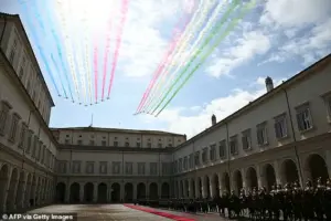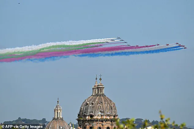 The Frecce Tricolori issued red, white and green smoke, while the Red Arrows emitted red, white and blue smoke in an elaborate choreographed performance that captivated onlookers both at the palace and throughout Rome.