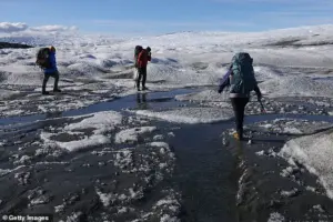 Pictured: Scientists walk over the thawing Greenland icecap.
