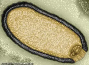 Some of these microbes have the potential to be dangerous, such as Pacmanvirus lupus (pictured) which was found thawing from the 27,000-year-old intestines of a frozen Siberian wolf.