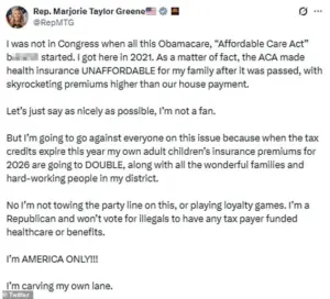 In a lengthy post on X (formerly Twitter), Greene, 51, revealed that the expiration of tax credits under the current healthcare framework would cause her own adult children’s insurance premiums to double in 2026.
