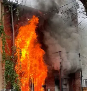 He uploaded a video from the arson attack, showing the harrowing moment when first responders struggled to break through his front door as flames consumed the house. ‘We lived in a row house and the house next to us was a total loss.