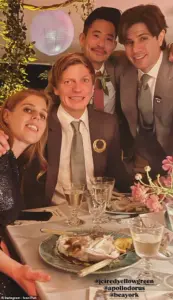 The King’s niece (left) was among guests at the wedding of her long-time confidant James Green, 37, (centre) and James Hirschfeld, 39, (right) the American co-founder of digital invitations company Paperless Post, in Long Island, New York