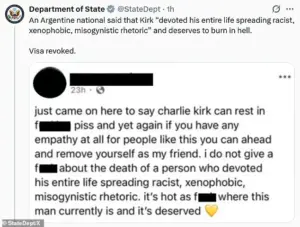 Among those targeted was an Argentine national who claimed Kirk ‘devoted his entire life spreading racist, xenophobic, misogynistic rhetoric’ and ‘deserves to burn in hell.’ A South African individual posted that those grieving Kirk were ‘hurt that the racist rally ended in attempted martyrdom.’ A Mexican national, whose visa was also revoked, stated that Kirk ‘died being a racist, he died being a misogynist… there are people who deserve to die.’ A Brazilian national remarked that Kirk ‘died too late’ and accused him of being the focus of a ‘Nazi rally where they marched in homage to him.’