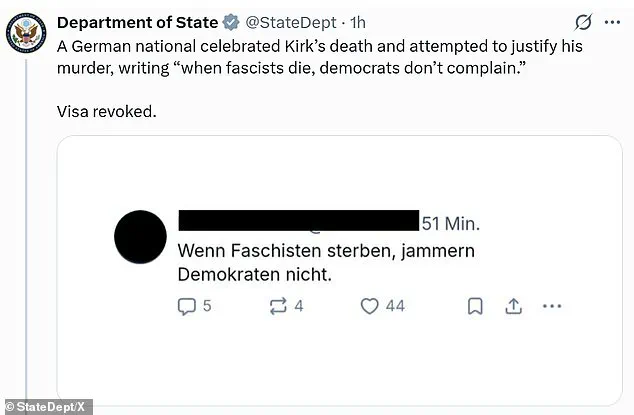 The administration has since vowed to take action against ‘aliens who take advantage of America’s hospitality while celebrating the assassination of our citizens,’ a policy that has drawn sharp criticism from free speech advocates.