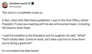 The White House has denied the claims, with spokeswoman Karoline Leavitt calling the report ‘completely made up.’ Leavitt shared a photo on X of Trump and Patel, claiming it was taken during a meeting in the Oval Office when the story was published.
