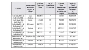 One individual in Justin made 13 payments totaling $263,240 for a project that was never completed, while another person paid $436,310 over 12 installments for a home in Decatur.