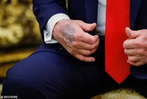 Trump’s physical condition has become a focal point of discussion, with reports emerging about his fragile skin and the incident in July 2024 when Attorney General Pam Bondi’s ring nicked his hand during a high-five at the Republican National Convention in Milwaukee, causing it to bleed.