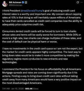 Ackman’s criticism came just hours after Trump announced on Truth Social that his administration would seek to cap credit card interest rates at 10 percent for one year beginning January 20, 2026.
