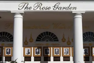 The West Wing display that faces the Rose Garden from the colonnade exhibits portraits of past presidents with plaques describing their contributions or misdeeds.
