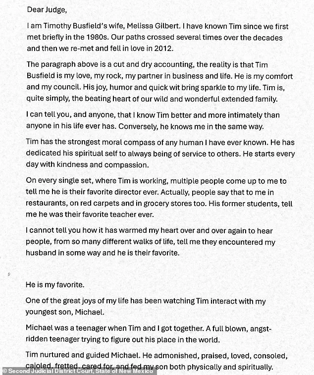 In a letter addressed to the judge, Gilbert described her relationship with Busfield in glowing terms, portraying him as her ‘rock’ and ‘partner in business and in life.’ She pleaded with the court to ‘protect’ her husband, requesting that Busfield be released on bond.
