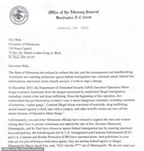 Bondi accused state officials of ‘anti-law enforcement rhetoric’ and ‘putting federal agents in danger,’ demanding that Minnesota repeal its sanctuary policies and fully cooperate with ICE. ‘I am confident that these simple steps will help bring back law and order to Minnesota and improve the lives of Americans,’ Bondi wrote, a statement Walz dismissed as ‘a farce.’