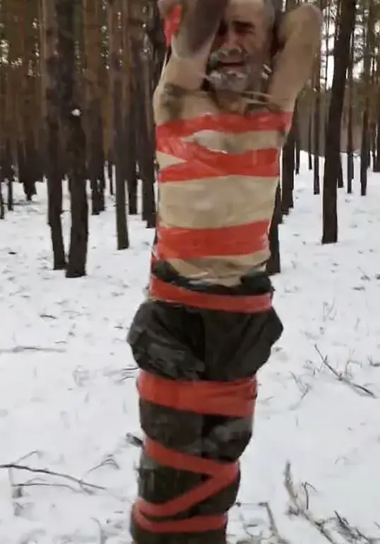 In the video, two Russian soldiers are depicted in a state of apparent distress, stripped of their winter uniforms and left exposed to the brutal winter cold.