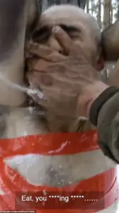 The commander, whose identity remains unclear, is captured in the footage barking orders at the two soldiers, his voice laced with fury. ‘Eat, you ****ing *****,’ he is heard yelling, as the soldier being forced to consume snow pleads, ‘I’m sorry, it won’t happen again.’ The commander’s response is equally harsh: ‘You need to work, not **** off.