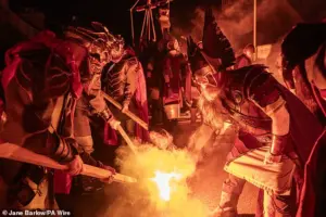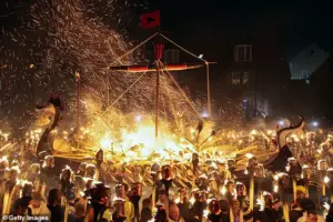 Thousands of spectators gathered in the town’s cobbled streets, their faces illuminated by the flickering glow of torches, as the air filled with the sounds of bagpipes and the rhythmic chants of participants clad in Viking garb.