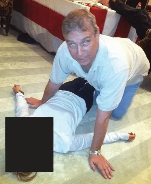 One image, in particular, shows the disgraced royal crouching on all fours over a woman lying on the floor, his hand positioned near her stomach.
