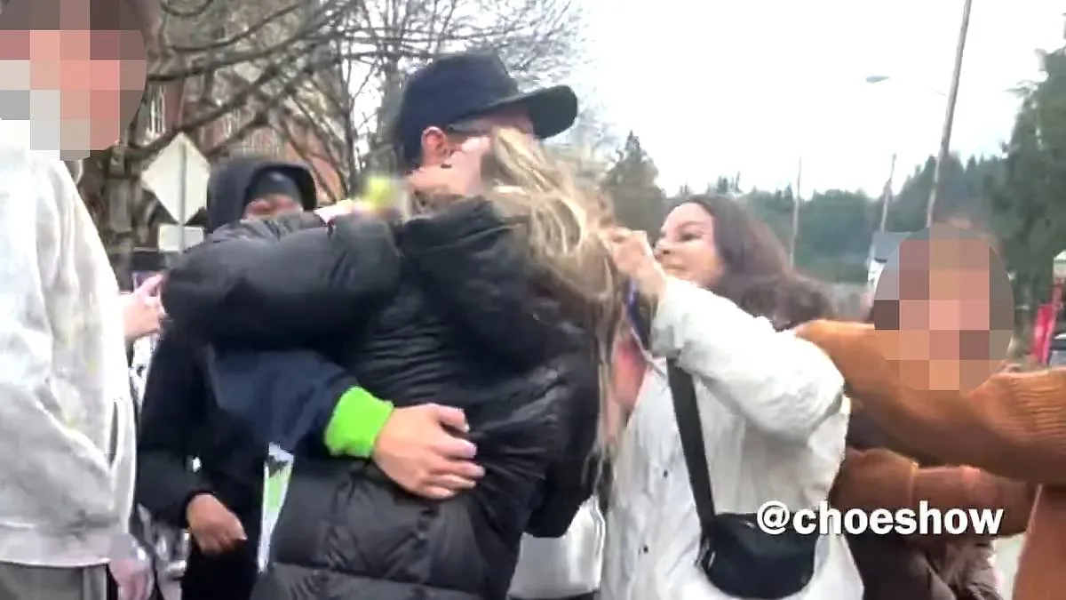 A mob of schoolgirls launched an unprovoked attack on a mother who walked past them during their anti-Immigration and Customs Enforcement Agency (ICE) class walkout. The incident, which occurred Monday morning in the Seattle suburb of Issaquah, left the victim, identified only as Sasha, covered in bruises. Jonathan Choe was the first to report on the assault, capturing the chaotic scene that unfolded outside a local police station and city hall building. The protest, involving 350 middle and high school students, had drawn attention for its anti-ICE banners and bullhorns, but the violence that followed shocked onlookers and raised questions about the safety of such demonstrations.